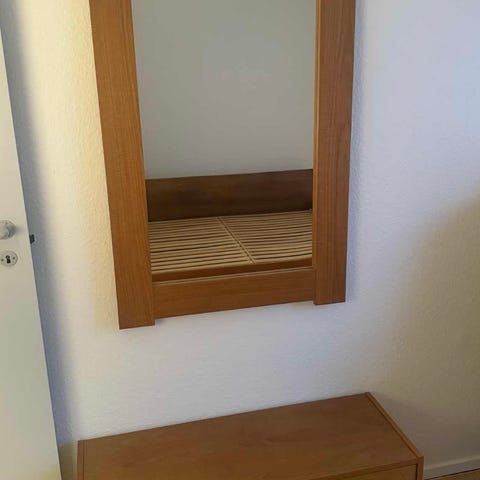 Entre møbel, lille hylde kommode af Melvin Mikkelsen i teak og flot spejl i asymmetriske form.