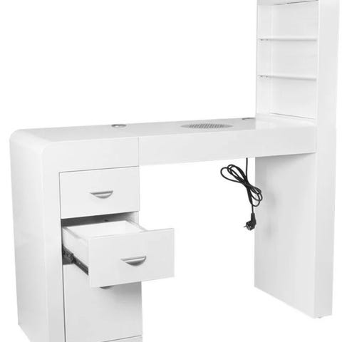 Super stilfuldt neglebord med indbygget støvsuger, kommer med elegant glasplade for nem rengøring, der er et skab og 2 surfer i den ene ende samt 3 hylder i den anden ende.