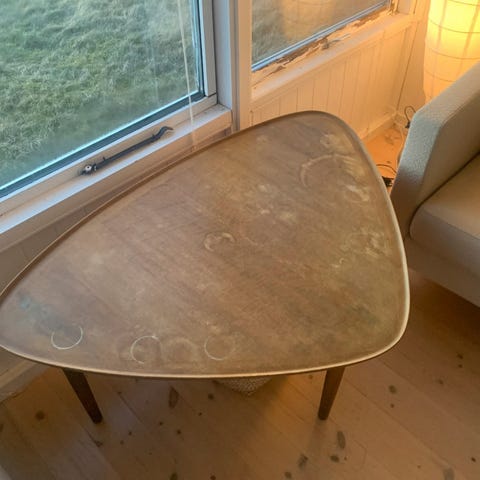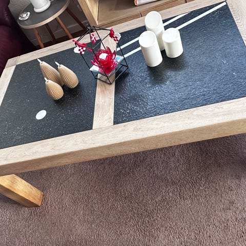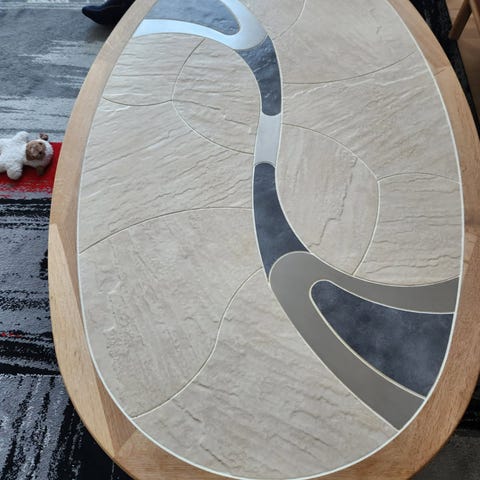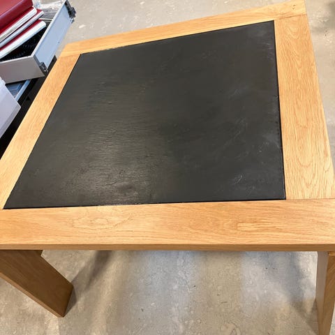 Pænt bord, udført i egetræs ramme, med stor mørk grå skiferplade.
