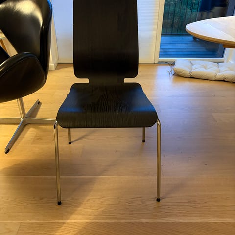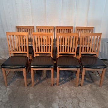 smukke og enkle stole, der kan være de ekstra stole ved gæste besøg. Står flot for sig selv i det fine sæbebehandlede egetræ, sæder og ryg af sort kunstlæder nappa læder. Elegant dansk design stol i stilrent design.