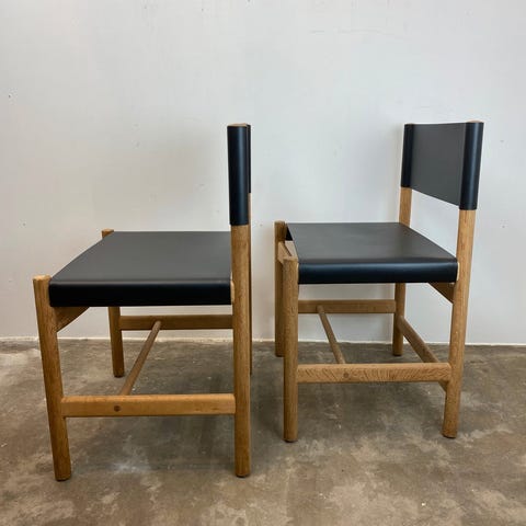 Par enkle skandinaviske minimalistiske stole i egetræ med sort Napa betræk.
