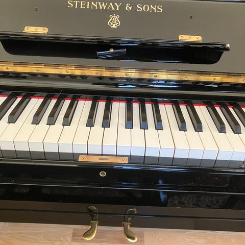 Meget sjældent liebhaverklaver. Årgang 1877. Krydsbestrenget, og med underdæmpermekanik. Kabinet nænsomt restaureret med den originale håndpolérede lak. Fantastisk instrument, med det ægte Steinway & sons touch. Originalt logo, velbevaret silketryk. Pris: D.kr. 35.200,00 inkl. 5 års garanti på stemmenagler, mekaniske dele, samt servicestemning, når klaveret efter ca 2 måneder, har tilpasset sig de nye forhold/luftfugtighed.