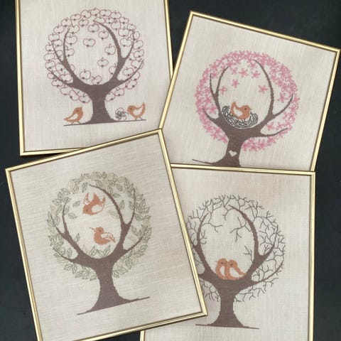 Smukke broderier med 3 forskellige motiver af planter - i laserede fyrretræsrammer. FLOT stand på alle. Forberedt til ophæng bagpå.