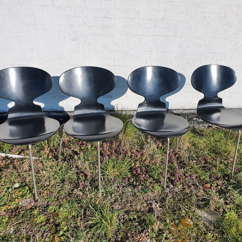 4 stk. Myrestole. Det er den første udgave med 3 ben og metalkapsel fra Friz Hansen. De sælges kun samlet for 3.500 kr. Prisen er fast. Preben genbrugsshop-Nakskov Lolland Falster.