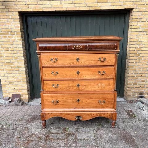 Stor gammel kommode/Dragkiste. Den er 128 cm.lang . Og den er 128 cm.høj og den er 58 cm. Dyb. Den er med 4 store skuffer og der er + en skuffe med hemmeligt rum. Prisen er fast. Prebensgenbrugsshop-Nakskov Lolland Falster.