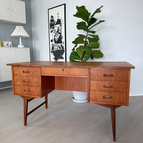 Fint udført lille skrivebord i teak med 2 skuffer og stort rum til bøger og mapper. Prebensgenbrugsshop-Nakskov Lolland Falster.