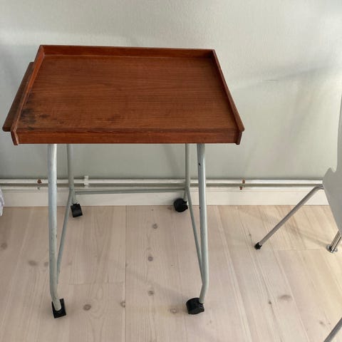 Fint lille skivebord/symaskindebord i teak. Jeg ved ikke om symaskinen virker,men den mangler trækremmen. Prisen er fast på 1.200 kr. Prebensgenbrugsshop. Nakskov Lolland falster.