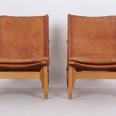 Er fremstillet i mørk træramme, samt sæde, ryg og armlæn polstret med mørk brunt læder/skind.