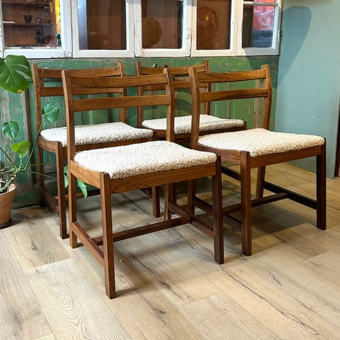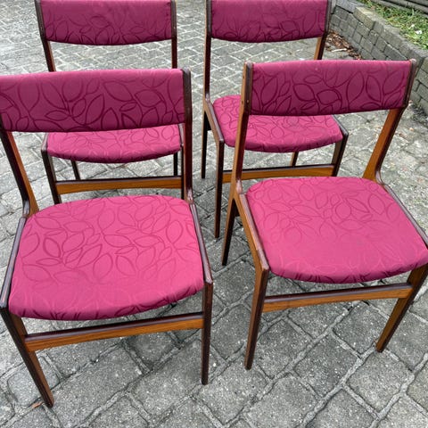 4 Lækker retro spisebordsstole i palisander. Ny betrukket med stof. Fremstilet af Dansk møbelproducent i ca. 1960’erne. Fremstår i super stand. Evt kan lev aftales. Pris er pr. Stol.