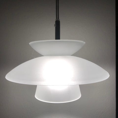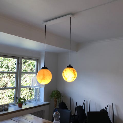 Pæn lampe, beklædt med sort stof og plastafdækning i bunden, som gør, at lyset ikke blænder.