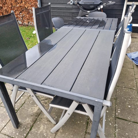 Havebord med 2 stole. Stolene skal ha skiftet nogen pinde men stellet på Stolene er ok.Bordet sælges kun sammen med stolene for 750 kr samlet. Bordet er 105 cm langt 65 cm. Bredt og det er 68 cm. Højt. Preben genbrugsshop-Nakskov.