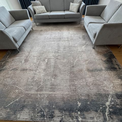 Lækker syv person sofa med tre sofabord. Fremstår i super stand.