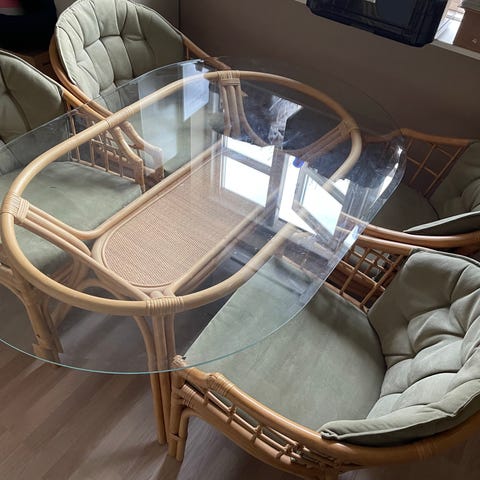 Lækkert retro sæt i den smukkeste farve! Udført i træ med kanvas, bord med stel i metal, fremstår med letter brugsspor, i form af pletter på stole(ikke forsøgt fjernet) sælges samlet. Levering kan tilkøbes