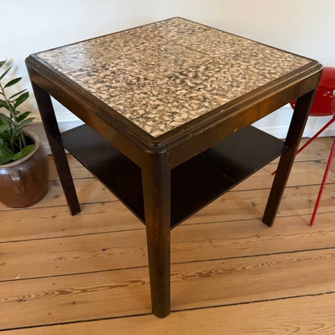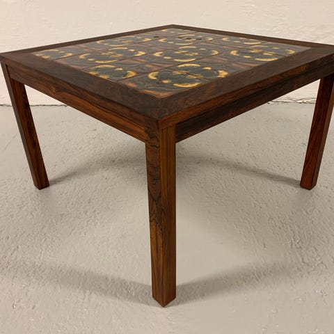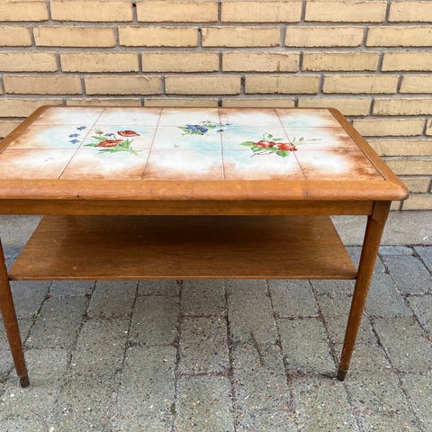 Bordpladen er belagt med råhvide kakler, som er bemalet med blomstermotiver i brune nuancer.