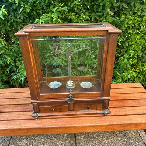 Lægevægt/medicinvægt/apotekervægt i messing med div tilbehør.