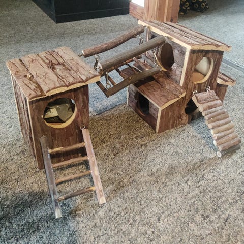 Hej! Jeg sælger et lille hus til gnaver med et hø-hæk. Længden 58, højden er 26 og bredden er 30. Der er nogle små brugsspor, men de kan nemt fjernes med vand. Pris: 20 kr. Skriv endelig, hvis du er interesseret!