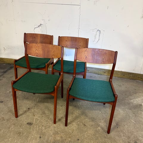 4 smukke ny polsteret spisebordsstole i teaktræ betrukket med ægte læder. Udført på uldum møbelfabrik. Samlet pris inkl levering