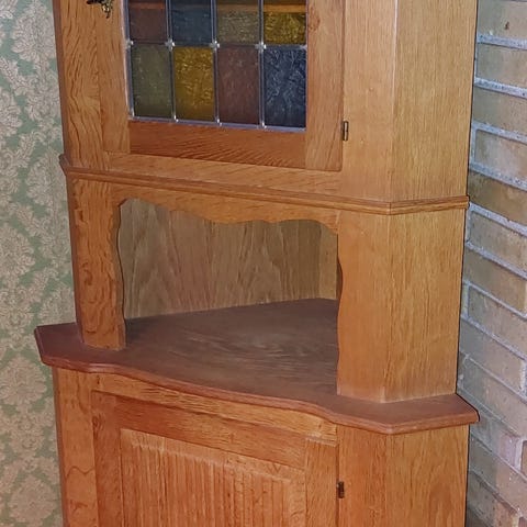 Flot charmerende hjørneskab med flot glas låge. Glasskab med hylder.