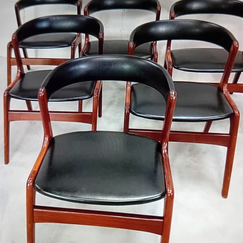 6 smukke ny polsteret Kai Kristiansen spisebordstole model 31 udført i teaktræ. Samlet pris. Levering kan tilkøbes