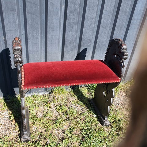 Klaverbænk med drage udskæringer. Den er fra 1918