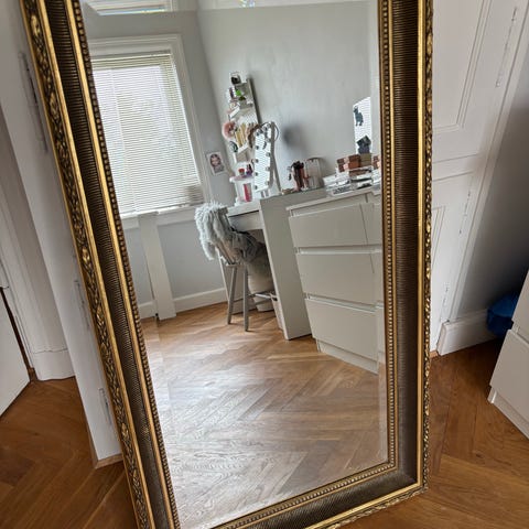 Smukkeste antikke spejl med guld og sort ramme. Bagpå forfindes der et mærke som er dateret til Maj 1925. dog spejlglasset vurderes til at være af nyere dato. Virkelig smukt og dekorativt vægspejl, der ville pryde en hver entre eller soveværelse.