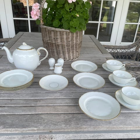 Testel Dråben fra Lyngby. Der er 11 par kopper 3 stk. Ekstre underkopper 5 stk.kage Tallerkener den ene med et lille kanthak tekande og 2 stk flødekander. Sælges kun samlet og prisen er fast. Prebensgenbrugsshop Nakskov.