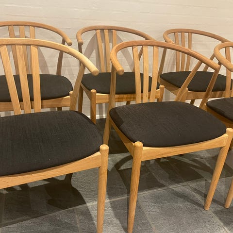 6 smukke No møller Spisebordstole i massiv sæbebehandlet egetræ, model 84. ny flettede og i flot stand. Sælges samlet. Levering kan tilkøbes