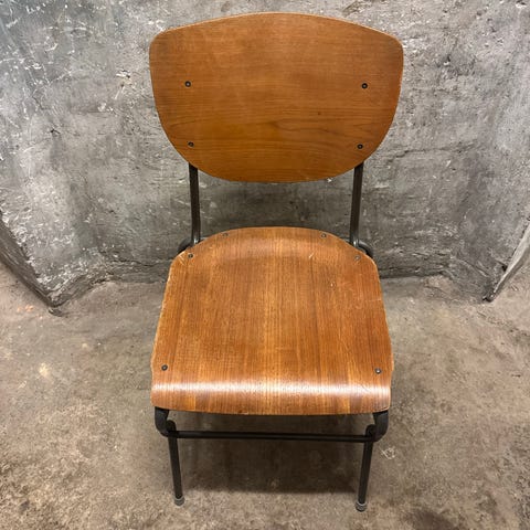 6 stk. Gamle skolestole I teak. Der er 45 cm. Fra gulv til sædet. De sælges kun samlet for 1000 kr. For alle 6 stole. Prebensgenbrugsshop-Nakskov. Lolland Falster