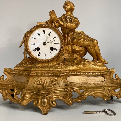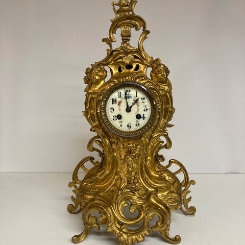 Lille, flot udført kaminur, udført i egetræ, med messing-udsmykninger og urværk fra Warmink (Holland).
