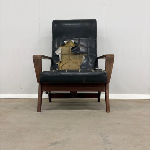 Smuk lænestol udført i teaktræ, koldskums hynder, betræk trænger til rens/ompolstring, kan dog sagtens bruges som de er. Levering kan tilkøbes