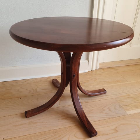 Lille rundt bord, med 3-fod, på drejet søjle.