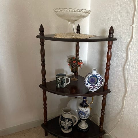 Hjørnereol med 3 hylder. Den er 80 cm. Høj med knopperne. Prebensgenbrugsshop-Nakskov Lolland Falster.