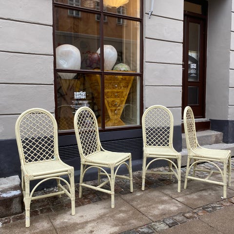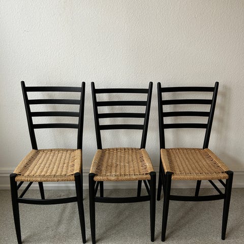 2 moderne stole produceret i italien med flet sæde og ryg i krom stel. Nogle plast dupper mangler, en smule anløb der forsigtigt kan slibes væk. ellers udemærket stand for alderen. Prisen er for begge stole.