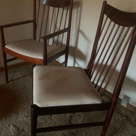 6 smukke spisebordsstole i teaktræ. Betrukket med ægte læder samt nyt skum. Fremstillet ved VAMO møbelfabrik. Samlet pris inkl levering