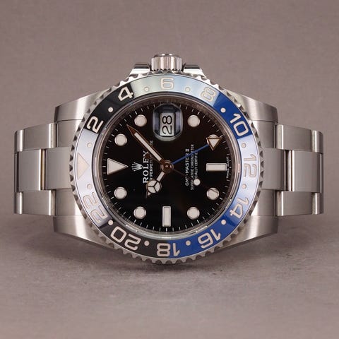 Rolex GMT – Master II, ref. 126710BLNR “Batgirl” fra september 2024. Uret har derfor Rolex garanti verden over til september 2029. Uret er fabriksnyt.