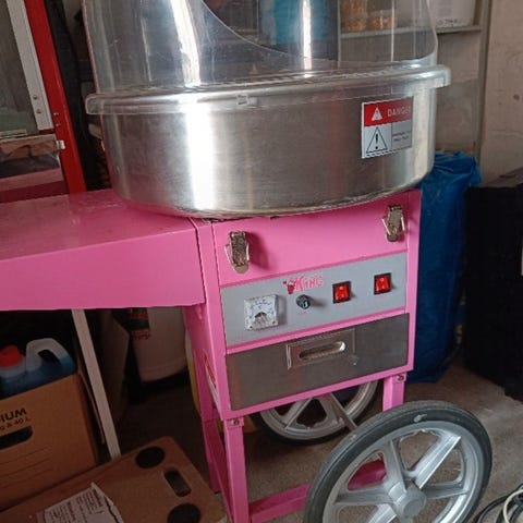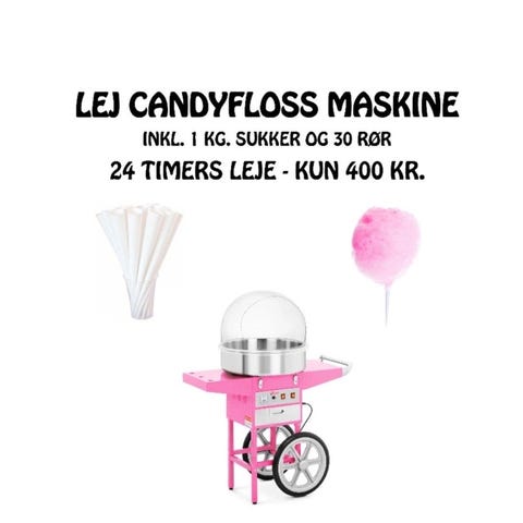Lej gennen Hygglo: https://www.hygglo.dk/4b0-candyfloss-maskine-pa-vogn