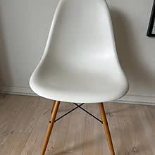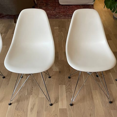 Charles Eames. Sæt på fire skalstole med gennemfarvede skaller af hvid polypropylen. Wirestel i forkromet stål. ‘Eiffel’ Fremstillet hos Vitra, model DSR. Fremstår med almindelige brugsspor og mærker. Sælges samlet. Levering kan tilkøbes