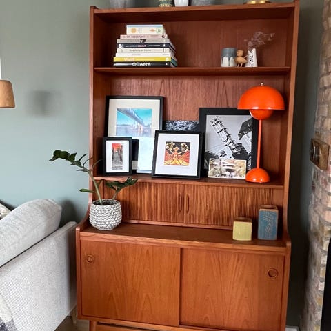 Johannes Sorth reol med skuffer, jalouiselåge, skriveplade samt hylder af eg. Model Bornholmer reol, fremstillet hos Nexø Møbelfabrik. H. 182 B. 100 D. 42 cm. Ikke så tit vi ser dem i eg. 😃