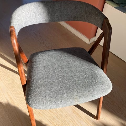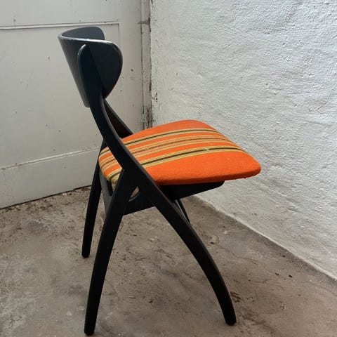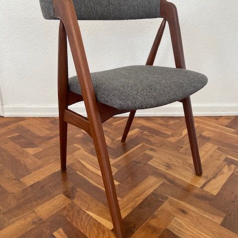 4 smukke ny polsteret savbukke stole i teak. Betrukket med nyt skum og stof. Designet af TH Harlev. Flot stand. Samlet pris.