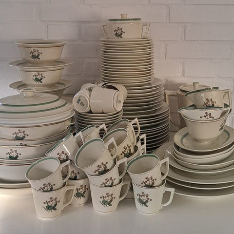 Kgl.stel hjertegræs. Der er 8 kaffekopper 11 moccakopper 6 tekopper 30 underkopper kaffekande stor sukkerskål lille vase salt bøssen. Det hele sælges kun samlet for 1.200 kr. Prebensgenbrugsshop Nakskov Lolland falster.