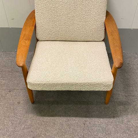 Grete Jalk. Lækker retro lænestol i palisander. Ny betrukket med uld stof originaler hynder. Fremstilet af Dansk møbelproducent i ca. 1960’erne. Fremstår i super stand. Evt kan lev aftales.
