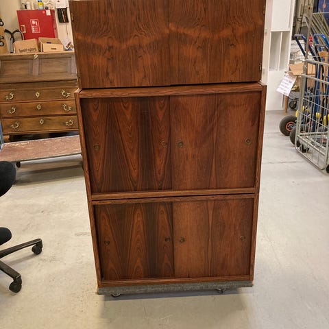 Smukt vægsystem fra HG møbler, udført i palisander. I alt 6 dele. Pæn stand. Monteres på vægen. Levering kan tilkøbes.