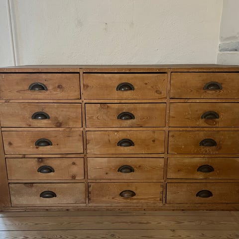Gammel, renoveret købmandsdisk med 10 store skuffer. Fra omkring år 1900. (købmandsdisk 1)