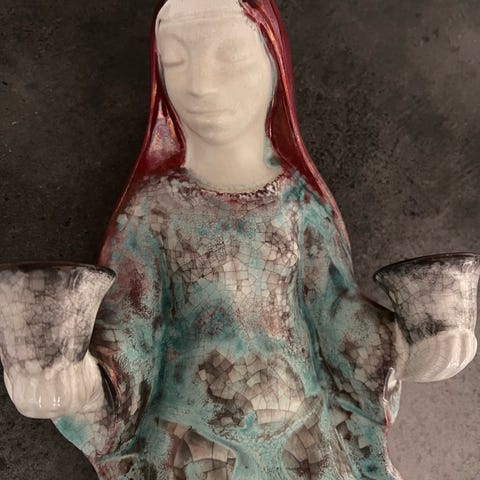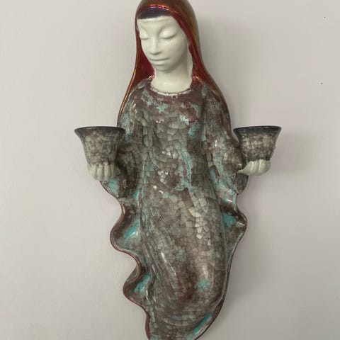 Michael Andersen, Vægstage, Madonna, 37cm høj, 21cm bred, nr. 3829. Pæn stand med meget lille nag på kjolen. Der medfølger to messingindsatser, som omformer stagen til fyrfadslys.