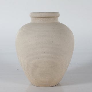 Imponerende og dekorativ stor gulvvase fra Knabstrup Keramik, udført i lys brun keramik med markante, grafiske motiver designet af Harald Folmer Gross. Vasen er et stærkt eksempel på dansk studiokeramik fra 1960’erne, hvor abstrakte former, symbolik og varme jordfarver gik hånd i hånd.