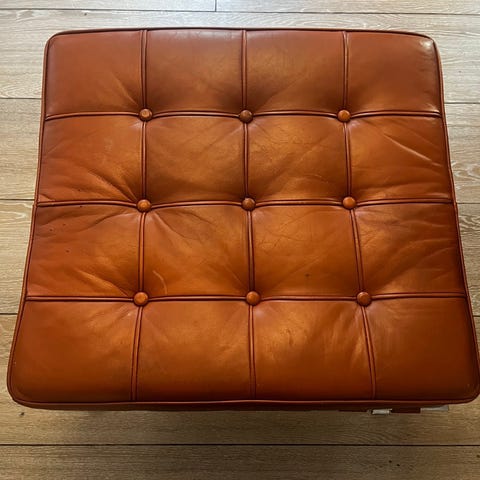 Stolen er i 'Relax' versionen, betrukket I brunt rugskind og stellet i poleret krom.