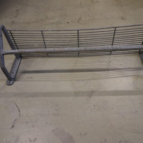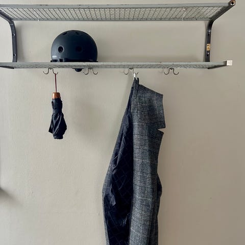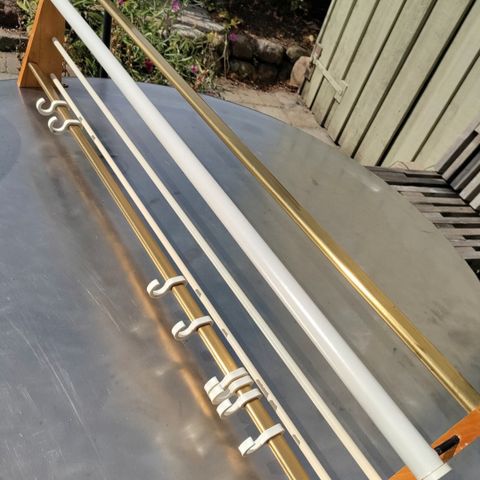 Gedigen stang og hylde, udført i metal, hvor hylden er i sortlakeret plade.