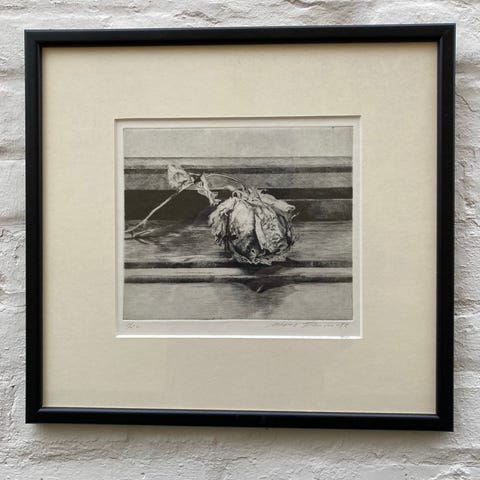 Tryk efter akvarel-maleri, i forfriskende farver, hvor motivet er friske frugter på et bord.