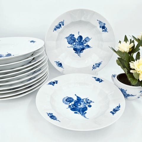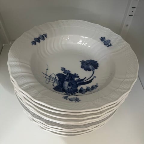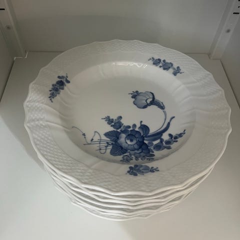 Her har vi det fine svejfede stel, Blå Blomst er produceret i 3 udgaver, Kantet, Flettet og svejfet, det svejfede kendes på den bølgende kant på tallerken, ekstra fin bemalingen samt nogle smukke linjer i selve porcelænet, ses som det fineste af de 3 stelforme. Denne tallerken kan bruges som desserttallerkner og lille frokost/ sildetallerken.