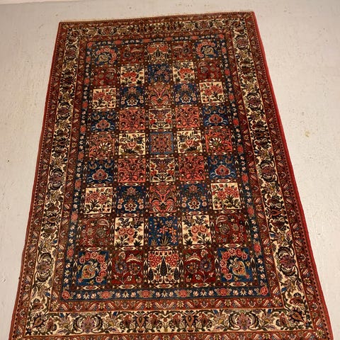 Flot håndknyttet tæppe, i smukke farver og blomstret mønster. Røde, beige, blå og grønne nuancer.